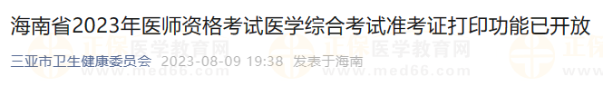 海南省2023年醫(yī)師資格考試醫(yī)學(xué)綜合考試準(zhǔn)考證打印功能已開放,提醒中西醫(yī)助理醫(yī)師考生考試安排2023年8月19日,各位考生做好考前準(zhǔn)備工作,避免錯過考試,具體通知內(nèi)容醫(yī)學(xué)教育網(wǎng)整理如下: