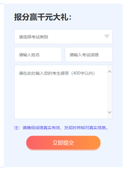 您只需將您的本次考試成績以及想說的內(nèi)容在“報分贏千元大禮”版塊進行提交,提交后將生成成績海報,手機掃描海報二維碼,將手機上的頁面發(fā)送給好友為您點贊,或者將海報保存發(fā)到朋友讓您的朋友長按識別您海報為您點贊。