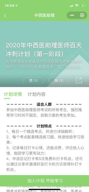 第三步:選擇備考科目后即進(jìn)入學(xué)習(xí)計(jì)劃選擇的頁面,請選擇“您的備考計(jì)劃”,如中西醫(yī)執(zhí)業(yè)醫(yī)師百天沖刺計(jì)劃(第一階段),然后點(diǎn)擊下方“加入計(jì)劃 開始學(xué)習(xí)”按鈕,開始正式進(jìn)入打卡學(xué)習(xí)。