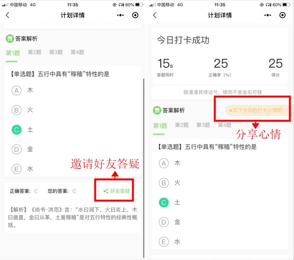 做完題后,可以查看每道題的解析和整體做題情況,然后點(diǎn)擊“分享今日打卡心情”,輸入您要記錄的內(nèi)容,提交即可完成打卡。還可以邀請(qǐng)好來(lái)答疑,備考伙伴一起學(xué)習(xí)更有動(dòng)力。