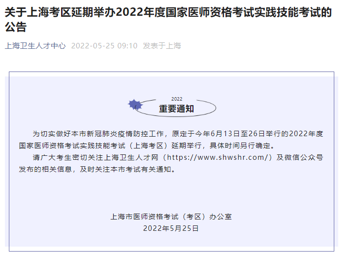 關(guān)于上海考區(qū)延期舉辦2022年度國(guó)家醫(yī)師資格考試實(shí)踐技能考試的公告
