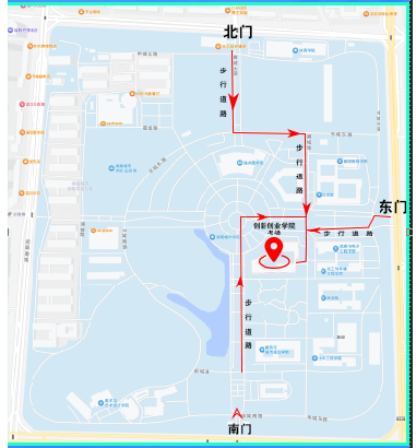 從學(xué)校東門(銀城大道,可開車或步行)、南門(迎賓路,只能步行)、北門(學(xué)府路,可開車或步行)均可進(jìn)入,按路線指示標(biāo)志到達(dá)考場。因?qū)W院建設(shè)施工,考場臨近南門的道路封閉,車輛從南門進(jìn)入時(shí)不能直接到達(dá)考場,建議考生乘坐公共交通工具前往。為保證及時(shí)參加考試,建議提前半天到達(dá)學(xué)校,熟悉前往考場路線,從學(xué)校南門到達(dá)考場步行預(yù)計(jì)15分鐘。