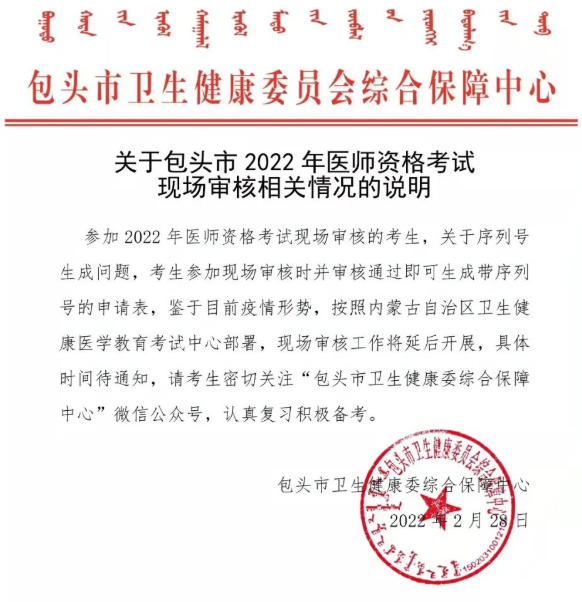 2022年內(nèi)蒙古包頭考點(diǎn)中西醫(yī)助理醫(yī)師資格考試現(xiàn)場審核相關(guān)情況的說明
