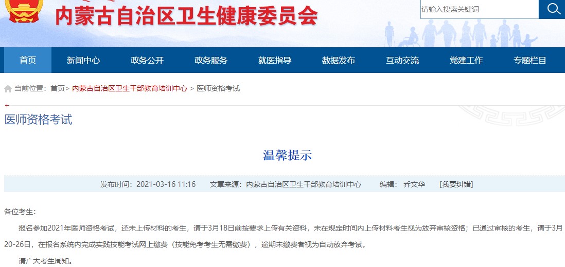 內(nèi)蒙古考區(qū)2021年醫(yī)師資格考試審核材料上傳和技能繳費(fèi)溫馨提示