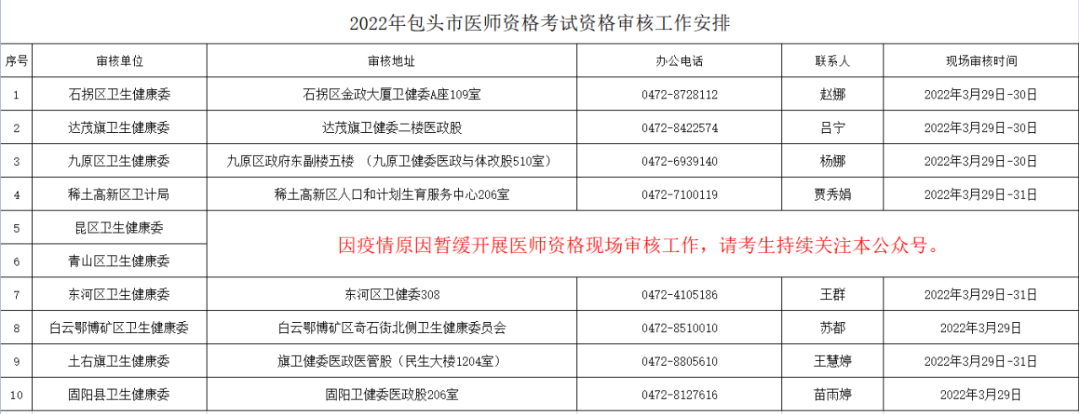 請(qǐng)各旗縣區(qū)報(bào)名考生在規(guī)定的時(shí)間內(nèi),到單位所屬旗縣區(qū)提交報(bào)名資料進(jìn)行資格審核,考生在審核時(shí)要嚴(yán)格遵守審核點(diǎn)的疫情防控政策。因疫情原因?qū)壕忛_展審核工作的審核點(diǎn),請(qǐng)考生持續(xù)關(guān)注“包頭市衛(wèi)生健康委綜合保障中心”公眾號(hào)。