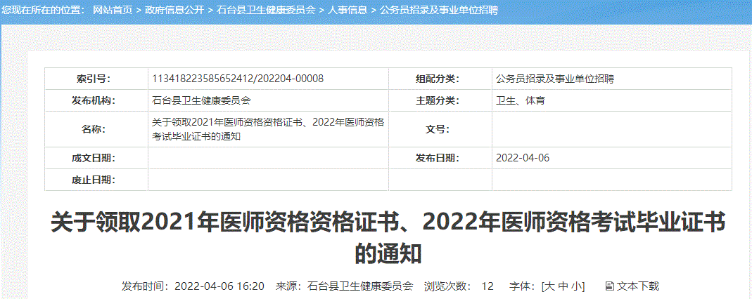 - · 安徽池州石臺縣考生開始領(lǐng)取2022醫(yī)師資格證書