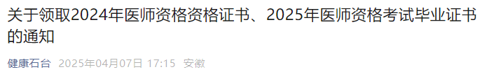 2024年安徽石臺縣中西醫(yī)助理醫(yī)師資格證書開始發(fā)放,5月20日前領(lǐng)取