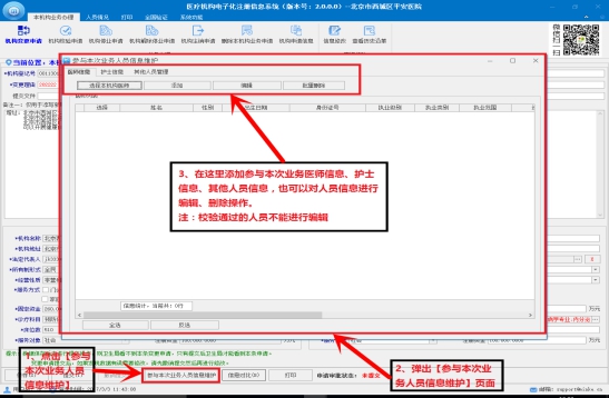 保存機構注冊申請后點擊【參與本次業(yè)務人員信息維護】添加參與本次業(yè)務醫(yī)師信息、護士信息、其他人員信息。