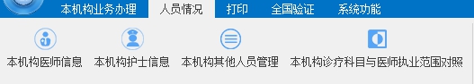 l 人員情況功能包括本機(jī)構(gòu)醫(yī)師信息、本機(jī)構(gòu)護(hù)士信息、本機(jī)構(gòu)其他人員管理、本機(jī)構(gòu)診療科目與醫(yī)師執(zhí)業(yè)范圍對照功能部分。