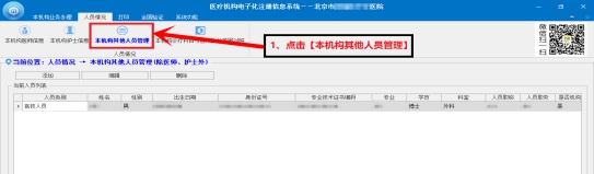 l 在圖中單擊【本機(jī)構(gòu)其他人員管理】按鈕,進(jìn)入“本機(jī)構(gòu)其他人員管理”窗口。此處可添加除醫(yī)師、護(hù)士以外的人員。