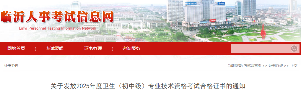 臨沂考區(qū)2025年度衛(wèi)生(初中級(jí))專業(yè)技術(shù)資格考試合格證書已由省人事考試中心下發(fā)至我市,現(xiàn)將證書發(fā)放有關(guān)事宜通知如下: