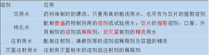 解讀:較難記憶的是純化水,純化水的應用抓關鍵詞:普通溶劑、飲片提取、口外溶稀釋、非滅菌精洗。飲用水關鍵詞:漂洗、粗洗。注射用水除了應用于注射劑外,還可用于滴眼劑。