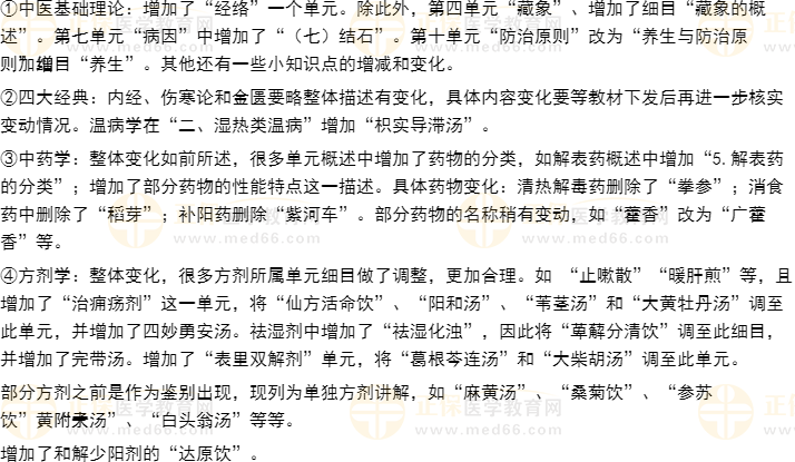 2.增加了諸多新內(nèi)容。如中醫(yī)基礎(chǔ)理論增加了“經(jīng)絡(luò)”和“養(yǎng)生”的相關(guān)內(nèi)容;中藥學(xué),在很多章節(jié)中增加了藥物的分類,增加了部分藥物的性能特點(diǎn);方劑學(xué),增加了表里雙解劑和治癰瘍劑,將其余單元的方劑調(diào)整到這兩個(gè)單元,如“大柴胡湯”調(diào)至表里雙解劑,“仙方活命飲”調(diào)至治癰瘍劑等;部分之前作為鑒別講解的方劑,作為單獨(dú)一個(gè)方劑出現(xiàn),如“麻黃湯”、“金鈴子散”等;傳染病增加了乙腦和結(jié)核病等,中西醫(yī)結(jié)合內(nèi)科學(xué)也增加了慢阻肺、間質(zhì)性肺炎、肺栓塞等疾病,總之,各科目變化還是非常多的。