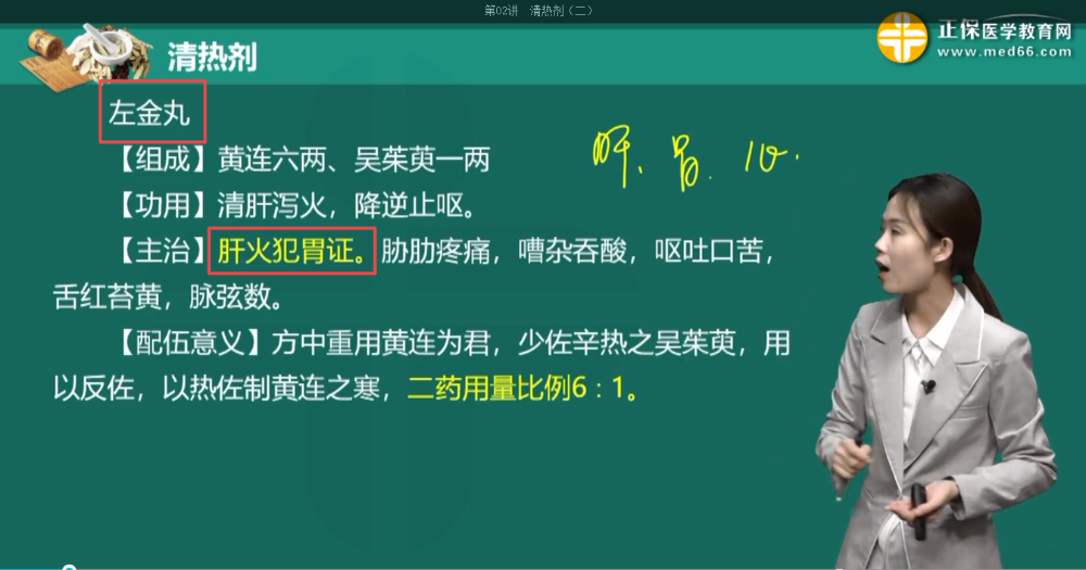 左金丸【主治】肝火犯胃證。脅肋疼痛,嘈雜吞酸,嘔吐口苦,舌紅苔黃,脈弦數(shù)。