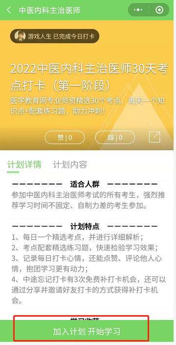 第三步:請選擇“您的備考計(jì)劃”,如“2022中醫(yī)內(nèi)科主治醫(yī)師30天考點(diǎn)打卡(第一階段)”,點(diǎn)擊下方“加入計(jì)劃開始學(xué)習(xí)”