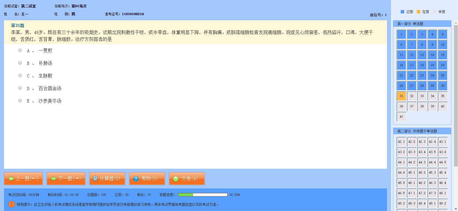 中醫(yī)內科主治醫(yī)師考試全部采用選擇題。單選題、共用題干單選題、共用備選答案單選題均由一個題干和五個選項組成,五個選項中只有一個為正確答案,其余均為干擾答案。干擾答案可以部分正確或完全不正確,考生在回答本題型時需對選項進行比較,找出最佳的或最恰當?shù)倪x項。