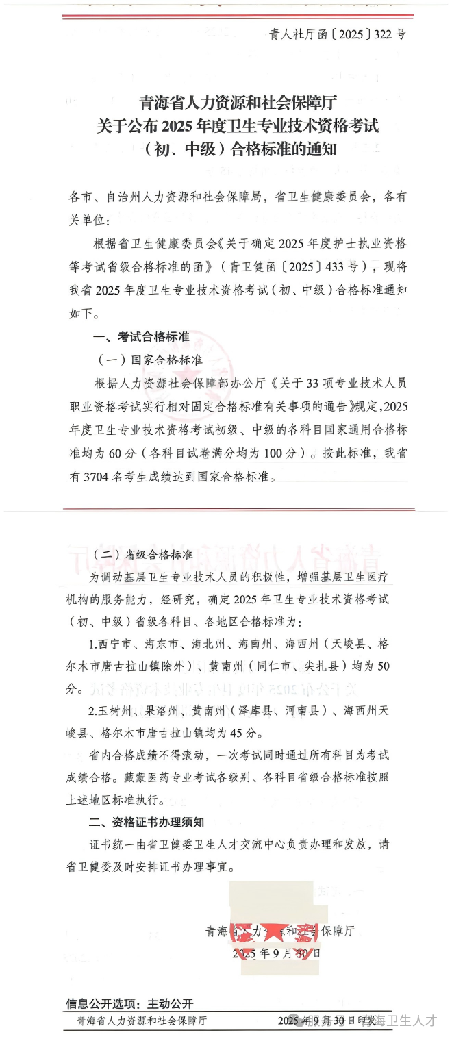 2025年度全國衛(wèi)生專業(yè)技術(shù)資格考試省級合格分數(shù)線已公布,青海省藏蒙醫(yī)藥專業(yè)技術(shù)資格考試參照全國衛(wèi)生專業(yè)技術(shù)資格考試省級合格標準執(zhí)行(后附青人社廳函〔2025〕322號《青海省人力資源和社會保障廳關(guān)于公布2025年度衛(wèi)生專業(yè)技術(shù)資格考試(初、中級)合格標準的通知》),即日起可在青海衛(wèi)生人才微信公眾號“個人入口”開始網(wǎng)上實名注冊(考生上傳個人照片須符合證件照要求)。2025年10月22日上午9:00起,開放線上電子證書(合格人員登記表)下載通道。