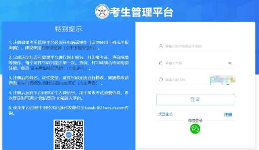 登錄考生管理平臺溫馨提示:登錄考生管理平臺必須在電腦端操作(請勿使用手機(jī)或平板電腦),建議使用谷歌瀏覽器。