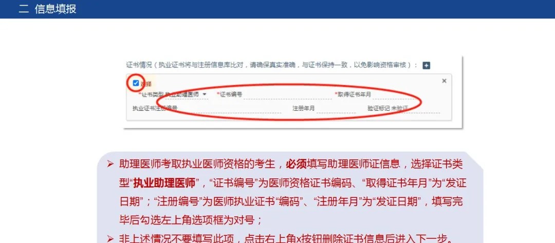 4.證書情況一欄,己獲得助理醫(yī)師資格,報考執(zhí)業(yè)醫(yī)師的考生必須填寫助理醫(yī)師資格證、執(zhí)業(yè)證信息;西學(xué)中人員的臨床執(zhí)業(yè)醫(yī)師資格證、執(zhí)業(yè)證信息必須填寫!報名參加助理醫(yī)師考試的、持本科及以上學(xué)歷畢業(yè)證報名參加執(zhí)業(yè)醫(yī)師考試的考生不允許填寫其他證件(如執(zhí)業(yè)技師、畢業(yè)證)。