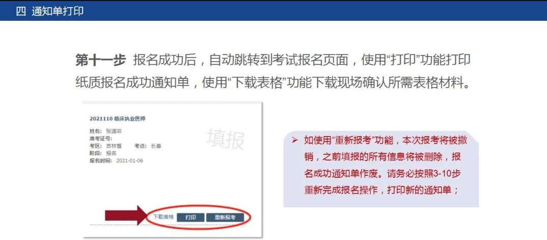 此時頁面跳轉(zhuǎn)到考試報名界面,點擊打印按鈕,打印《醫(yī)師資格考試網(wǎng)上報名成功通知單》