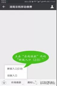 1.考生用手機(jī)微信打開“湖南非稅移動(dòng)繳費(fèi)”公眾號,點(diǎn)擊左下角“在線繳款”—“新版入口(2.0)”;