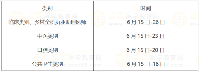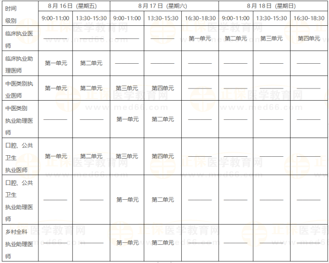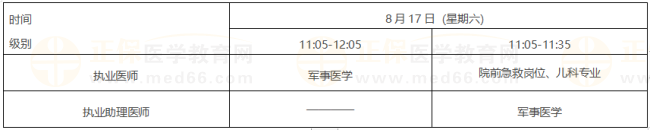 考試實行計算機化考試,軍隊現役人員加試軍事醫(yī)學、院前急救崗位和兒科專業(yè)加試相應內容。統(tǒng)一考試時間如下: