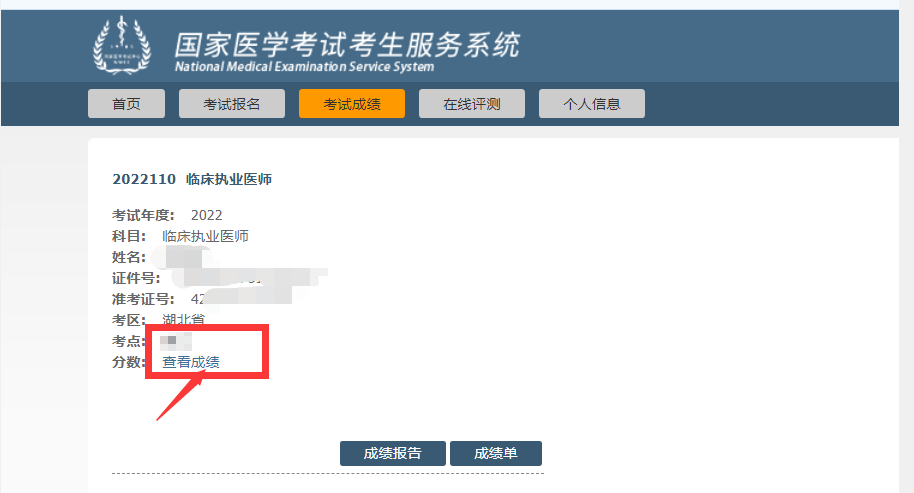 1、考生登錄國(guó)家醫(yī)學(xué)考試考生服務(wù)系統(tǒng)(以下簡(jiǎn)稱國(guó)網(wǎng))的“考試成績(jī)”欄目,點(diǎn)擊“分?jǐn)?shù)”進(jìn)入“查看成績(jī)”界面。