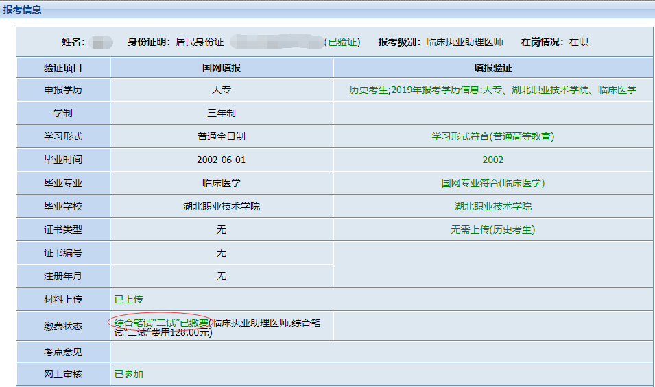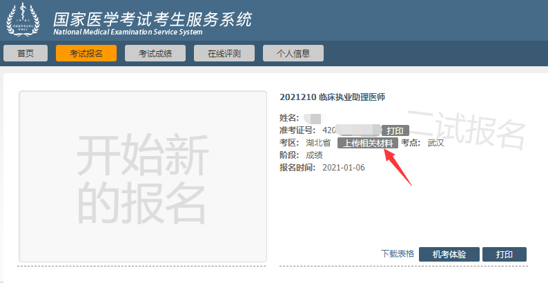 1、湖北考區(qū)在國(guó)網(wǎng)上完成二試報(bào)名的考生,進(jìn)入國(guó)網(wǎng)“考試報(bào)名”頁(yè)面,點(diǎn)擊“上傳相關(guān)材料”,跳轉(zhuǎn)至“湖北考區(qū)醫(yī)師資格個(gè)人申報(bào)平臺(tái)”(以下簡(jiǎn)稱“省網(wǎng)”)進(jìn)行繳費(fèi)。