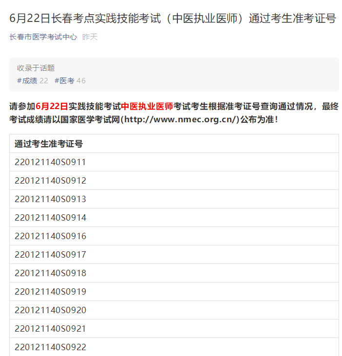 吉林長(zhǎng)春2021年中醫(yī)執(zhí)業(yè)醫(yī)師實(shí)踐技能考試成績(jī)合格名單(6月22日)