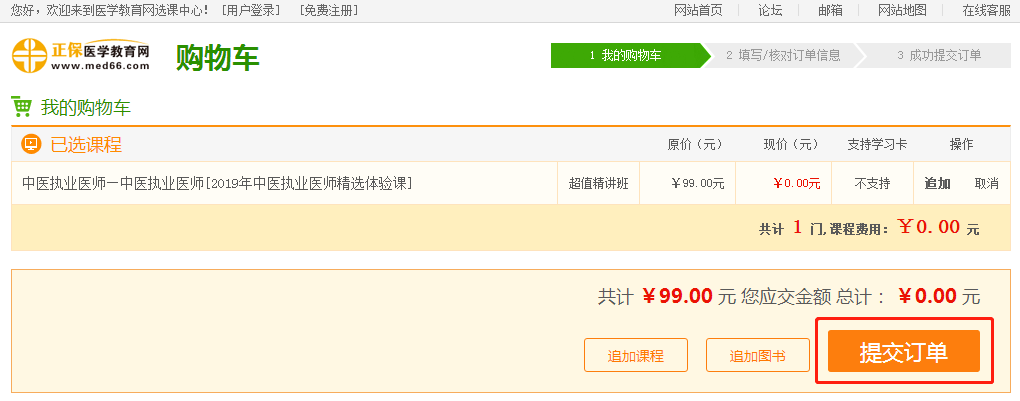 第一步:點(diǎn)擊“購課”按鈕,加入我的購物車;