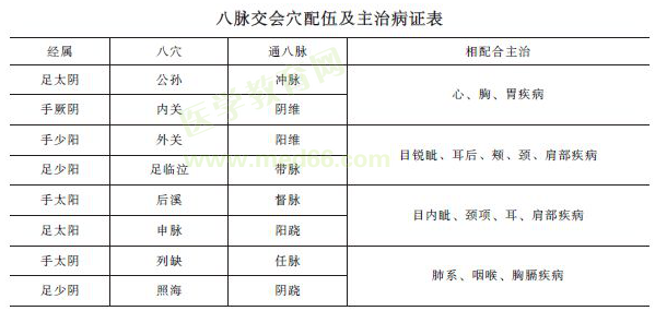 1.分布特點(diǎn)和組成:八脈交會穴均分布于肘膝以下,包括公孫、內(nèi)關(guān)、后溪、申脈、足臨泣、外關(guān)、列缺、照海。