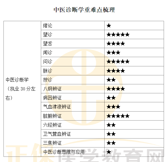 在2022年中醫(yī)執(zhí)業(yè)醫(yī)師綜合筆試考試中,中醫(yī)診斷學(xué)科目占總分值的5%,約30分,中醫(yī)診斷學(xué)除了考基礎(chǔ)內(nèi)容,還考察到了病例分析題,主要是八綱辨證中辨證論治的內(nèi)容,逐漸突出側(cè)重臨床的方向。具體重難點(diǎn)星級(jí)梳理如下: