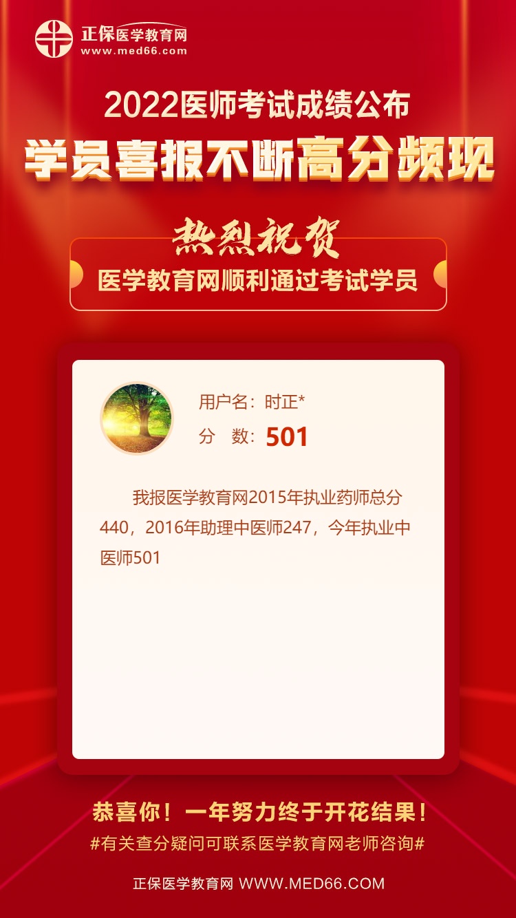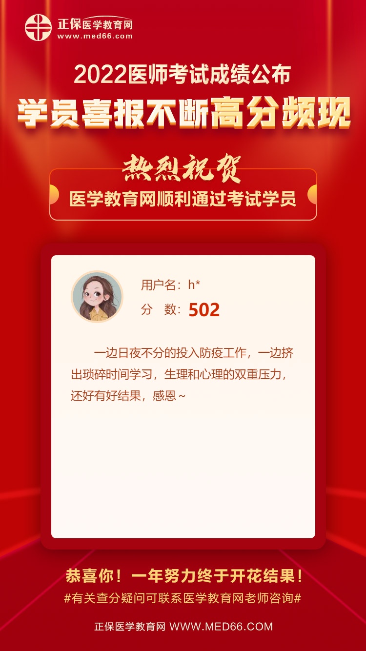 2022年醫(yī)師資格考試成績公布后,醫(yī)學教育網(wǎng)學員喜報不斷,高分頻現(xiàn)!在此醫(yī)學教育網(wǎng)小編熱烈祝賀各位順利通過考試的同學!同時也將大家成功的喜悅、備考心得一起分享給2023年考生。一起來看看吧!