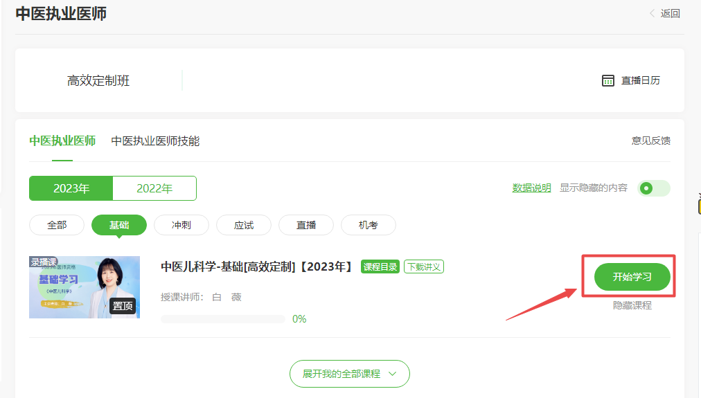 登錄學員代碼進入我的網(wǎng)校我的家,點擊“我的課程”,進入課程,選擇“2023年”,即可看到《中醫(yī)兒科學》課程,點擊開始學習即可。