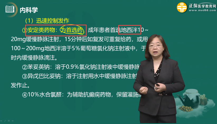 癲癇持續(xù)狀態(tài):安定類藥物為首選藥,成年患者首選地西泮。