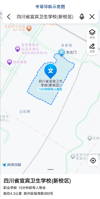 3、考生通過宜賓衛(wèi)生學(xué)校大門進入考場??紙霾惶峁┩\嚪?wù),請盡量選擇公共交通工具前往考場,以免影響考試。