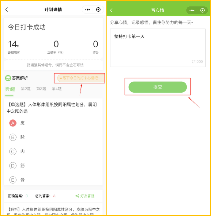 做完題后,可以查看每道題的解析和整體做題情況,然后點擊“分享今日打卡心情”,輸入您要記錄的內(nèi)容,提交即可完成打卡。