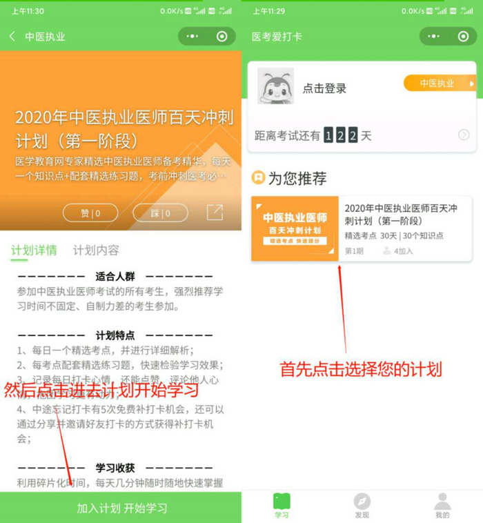 第三步:選擇備考科目后即進入學(xué)習(xí)計劃選擇的頁面,請選擇“您的備考計劃”,如中醫(yī)執(zhí)業(yè)醫(yī)師百天沖刺計劃(第一階段),然后點擊下方“加入計劃開始學(xué)習(xí)”按鈕,開始正式進入打卡學(xué)習(xí);