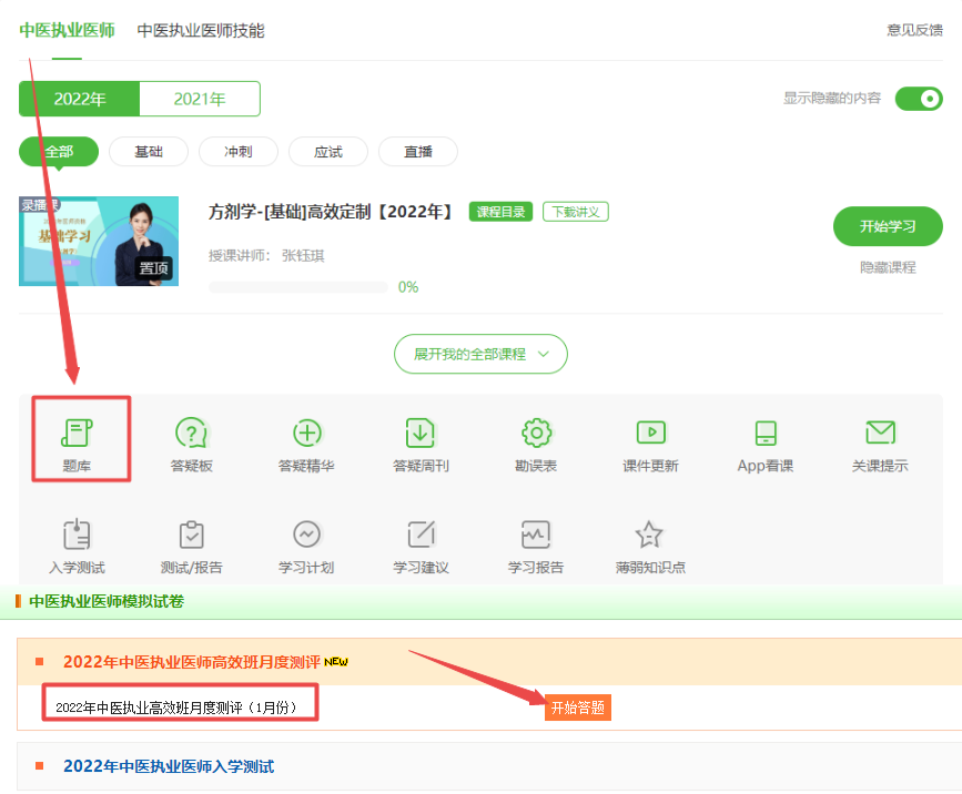 本服務(wù)僅限購(gòu)買2022年中醫(yī)執(zhí)業(yè)醫(yī)師高效定制班考生進(jìn)入。開課后可進(jìn)入我的網(wǎng)校我的家-題庫(kù)進(jìn)行測(cè)評(píng),或在app端點(diǎn)擊學(xué)習(xí)-做題進(jìn)入測(cè)評(píng)。考生在題庫(kù)做題提交后可查看考試結(jié)果、并及時(shí)進(jìn)行查漏補(bǔ)缺。
