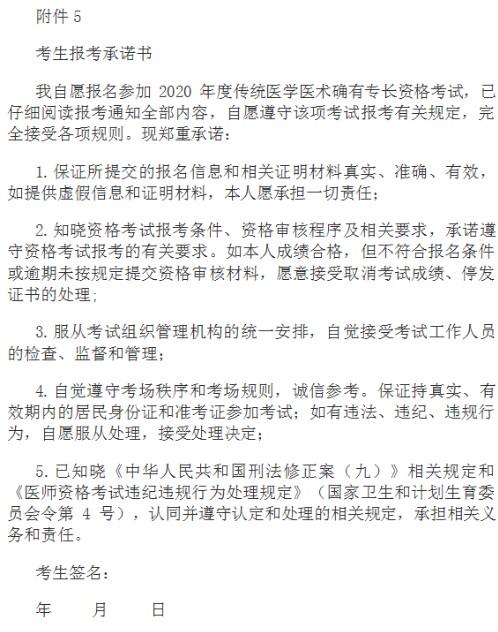3.兩名中醫(yī)(含中西醫(yī)結(jié)合)執(zhí)業(yè)醫(yī)師出具的《掌握傳統(tǒng)醫(yī)學(xué)診療技術(shù)證明》(附件3),證明其掌握獨(dú)具特色、安全有效的傳統(tǒng)醫(yī)學(xué)診療技術(shù);考生報(bào)考承諾書(附件5)