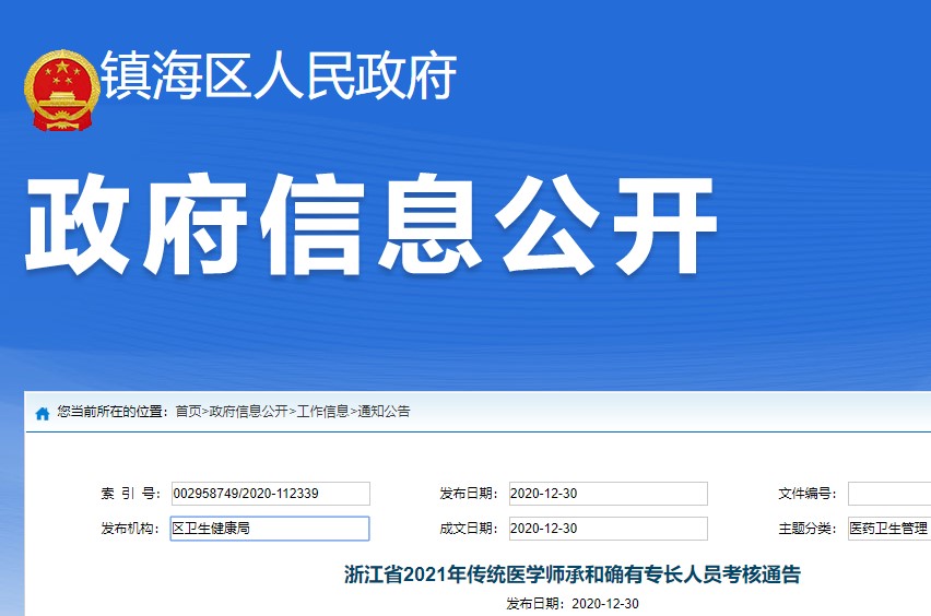 寧波鎮(zhèn)海區(qū)人民鎮(zhèn)府2021年傳統(tǒng)醫(yī)學(xué)師承和確有專(zhuān)長(zhǎng)人員考核通告已發(fā)布,報(bào)名工作定于 2021年1月18日9:00-2月8日17:00進(jìn)行?,F(xiàn)場(chǎng)審核確認(rèn)時(shí)間:2021年1月18日—1月29日(工作日)。