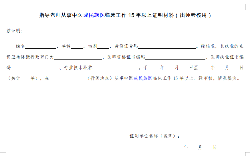 附件下載:出師考核從事中醫(yī)或民族醫(yī)臨床工作15年以上證明材料(僅供參考)
