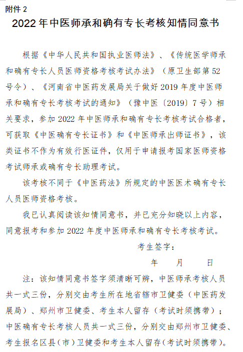 注:該知情同意書簽字須清晰可辨,中醫(yī)師承考核人員共一式三份,分別交由考生所在地省轄市衛(wèi)健委(中醫(yī)藥發(fā)展局)、鄭州市衛(wèi)健委、考生本人留存(考試時須攜帶);中醫(yī)確有專長考核人員共一式三份,分別交由鄭州市衛(wèi)健委、考生報名區(qū)縣(市)衛(wèi)健委和考生本人留存(考試時須攜帶)。