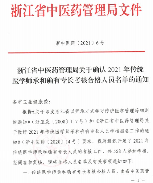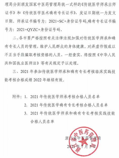 浙江省中醫(yī)藥管理局關(guān)于確認2021年傳統(tǒng)醫(yī)學(xué)師承和確有專長考核合格人員名單已發(fā)布,現(xiàn)將浙江省中醫(yī)藥管理局關(guān)于確認2021年傳統(tǒng)醫(yī)學(xué)師承和確有專長考核合格人員名單的通知公布,詳見附件。醫(yī)學(xué)教育網(wǎng)編輯為您整理相關(guān)通知內(nèi)容如下。
