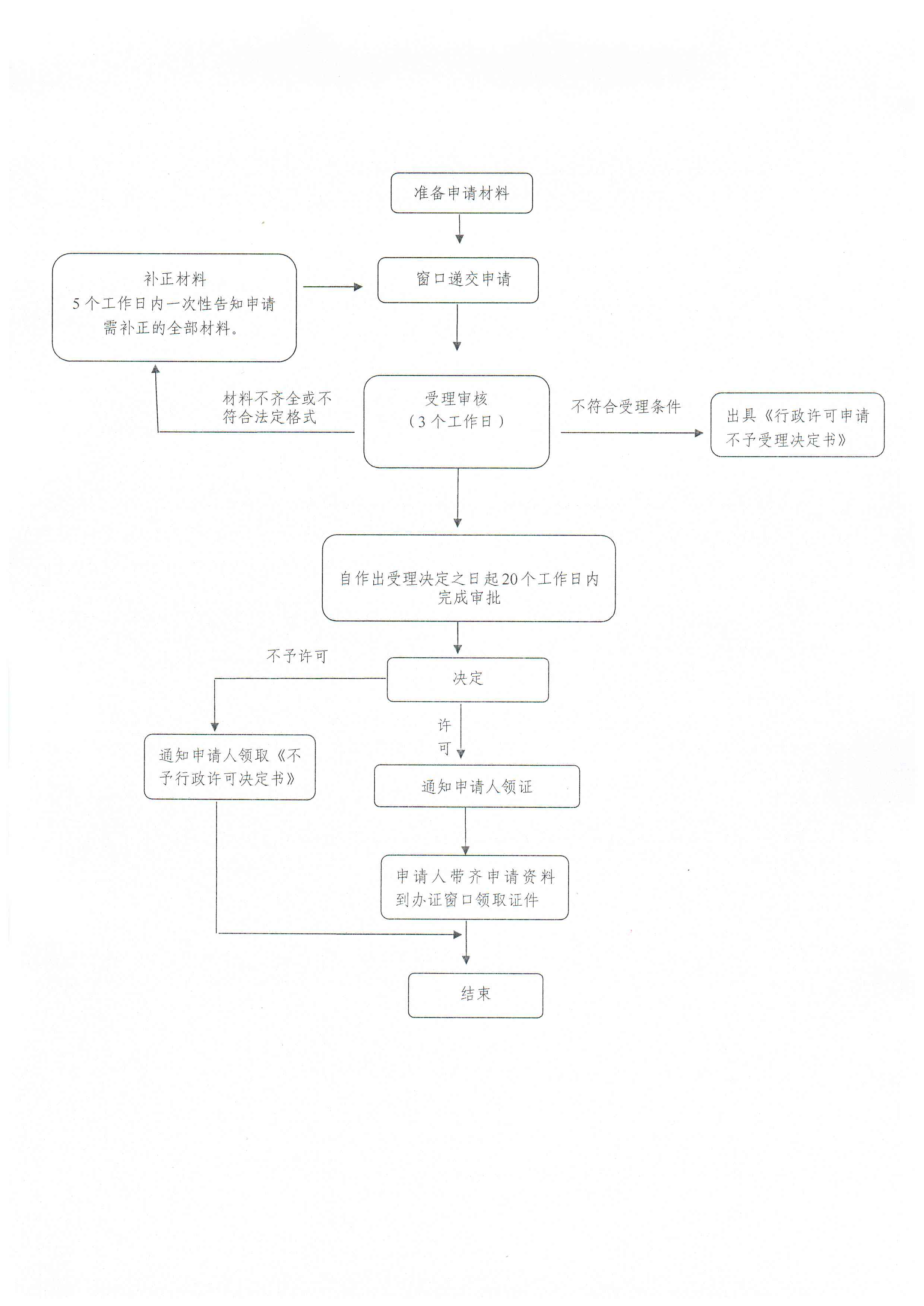 4.審查。受理后,審查人員對(duì)材料進(jìn)行審查,作出審查結(jié)論。符合審批條件的,出具相關(guān)證書(shū);不予通過(guò)的,出具《不予許可決定書(shū)》。