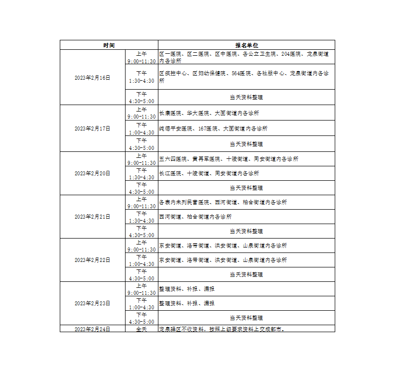 三、各醫(yī)院、各街道診所審核時(shí)間安排(見下表)。