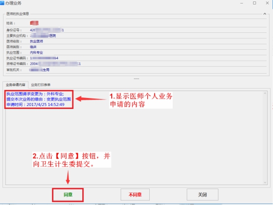 l 及時確認醫(yī)師的業(yè)務(wù)申請,并打印相關(guān)申請表。如:注冊申請、變更申請、重新注冊申請及備案注銷申請表。
