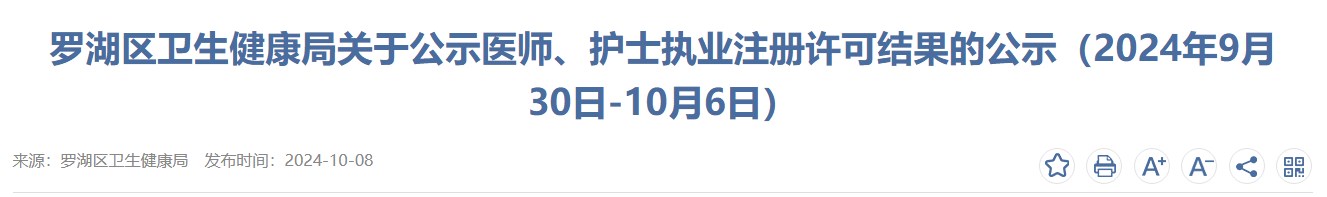 廣東深圳羅湖區(qū)2024年醫(yī)師資格執(zhí)業(yè)注冊許可結(jié)果公示(9月30日-10月6日)