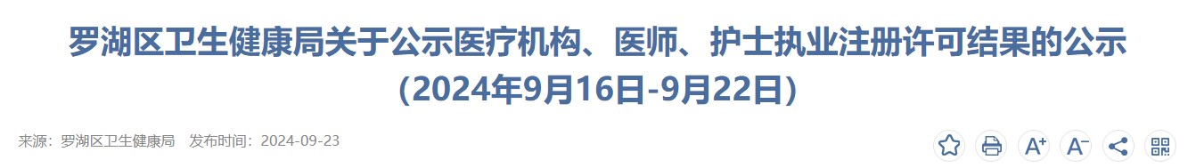 羅湖區(qū)衛(wèi)生健康局關于公示醫(yī)療機構、醫(yī)師、護士執(zhí)業(yè)注冊許可結果的公示(2024年9月16日-9月22日)