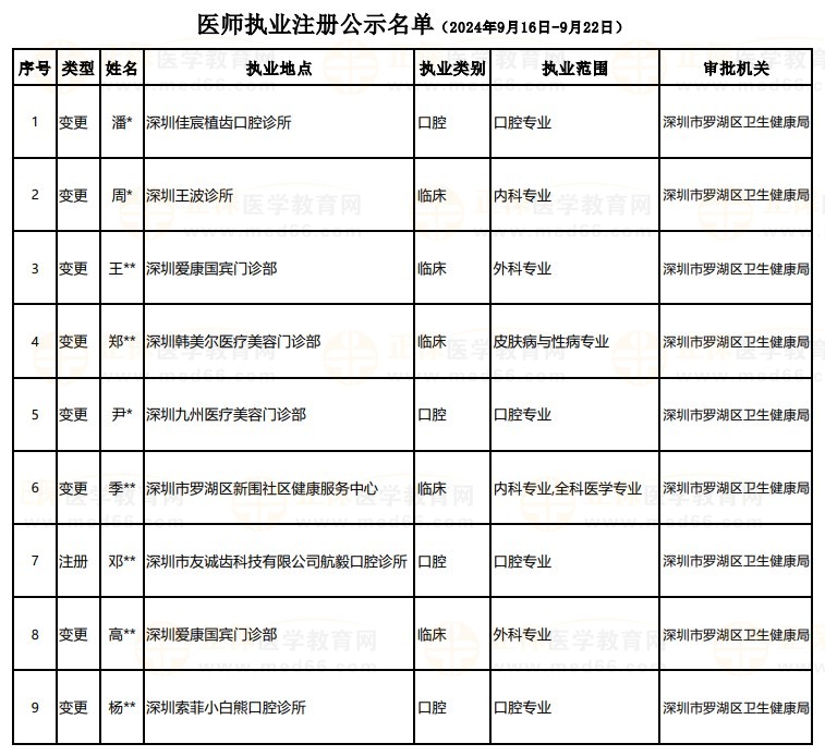 廣東深圳羅湖區(qū)2024年醫(yī)師資格執(zhí)業(yè)注冊許可結果公示(9月16日-9月22日)